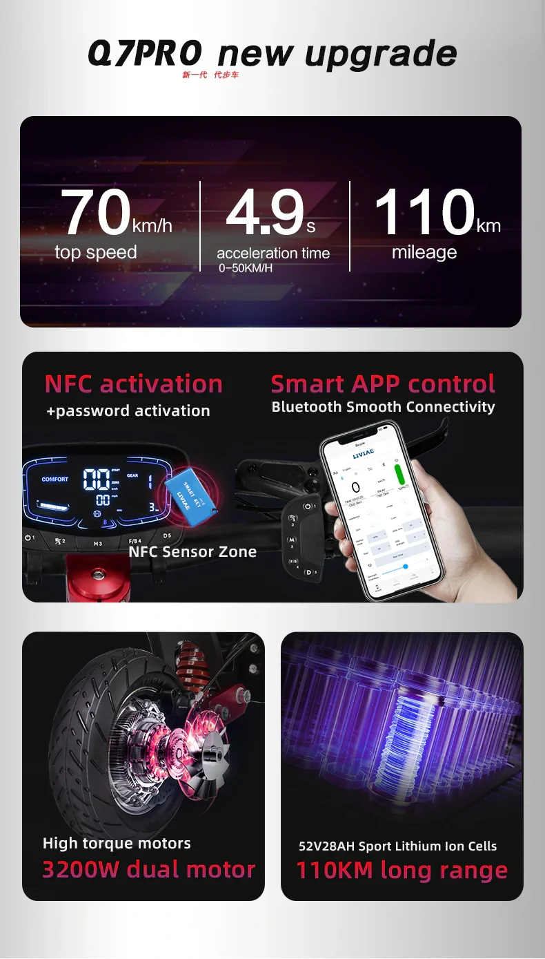 Avec un moteur de 3200 W et une vitesse de pointe allant jusqu'à 70 km/h, le scooter électrique BOYUEDA Q7 Pro Max est le choix parfait pour les déplacements quotidiens, les trajets courts et l'utilisation tout-terrain légère en ville.