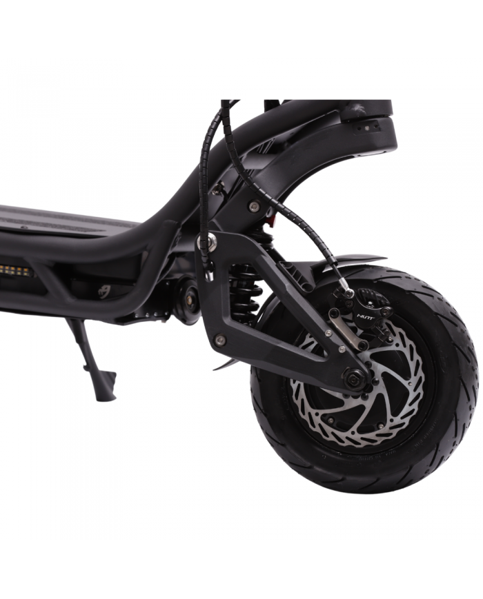 Pour effacer les défauts des trajets urbains, la Nami Burn-e 3 dispose d’un système de suspensions réglables hydrauliques à ressort. Les ressorts peuvent même être remplacés par des modèles plus ou moins souples en fonction de votre poids et de la sensation de conduite que vous préférez. Les pneus de 11 pouces tubeless permettront une excellente tenue de route et le freinage est assuré par deux freins à disque hydrauliques avec des étriers 4 pistons pour des arrêts rapides et sûrs. L’ABS électronique assistera le freinage afin de limiter les risques de blocage de roue. L’éclairage frontal est assuré par un phare que l’on retrouve aussi sur les Nami Klima et Blast. Un bandeau LEDs parcourt le tour du châssis et fait également office de clignotants. Un klaxon et un amortisseur de direction complète les équipements de la Nami Burn-e 3 afin de conduire en toute sécurité.