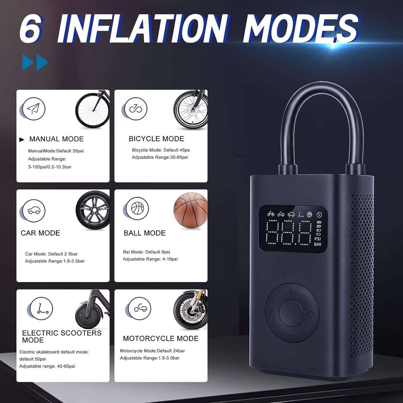 Grâce à son affichage numérique intégré, vous pouvez surveiller en temps réel la pression de votre pneu avec une précision au PSI près. Fini les approximations ou les manomètres analogiques peu fiables — ce compresseur vous permet de régler exactement la pression recommandée par le fabricant, que ce soit pour un vélo de route (60-100 PSI), un scooter électrique (30-50 PSI) ou un ballon de football (8-12 PSI). La détection automatique de la pression vous évite les surgonflages et protège vos pneus.