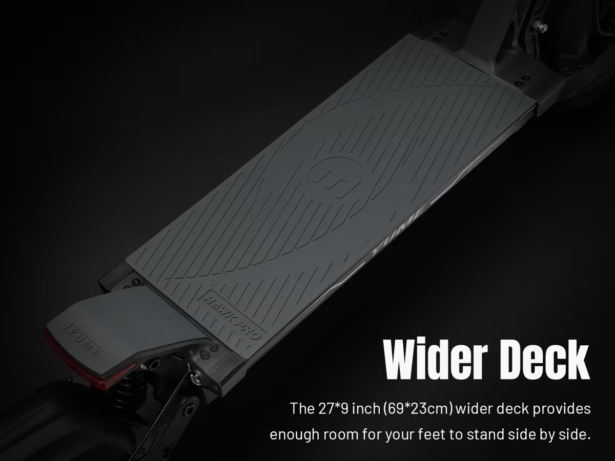 Pour ceux qui recherchent plus de puissance et de vitesse, YUME est heureux de présenter l'incroyable Hawk Pro. Cette version pro du YUME Hawk est dotée d'un nouveau plateau plus large et plus long, ainsi que de deux puissants moteurs de 3 000 W. Associé à deux nouveaux contrôleurs sinusoïdaux compacts sur mesure (Mosfet Super 6), il est alimenté par une batterie de 60 V 30 Ah ou 60 V 27 Ah. Les pneus tubeless de 10 pouces du Hawk Pro sont également plus larges (4,5 pouces de large), offrant une meilleure adhérence et des performances accrues.